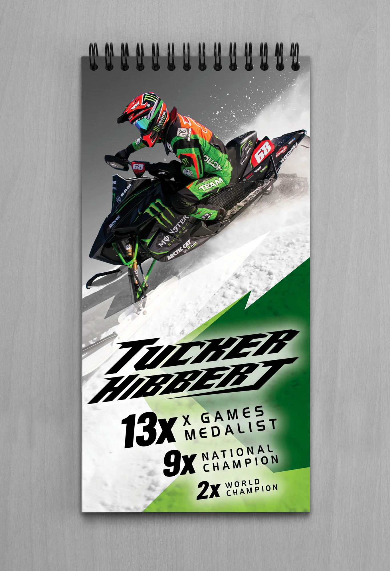 Media guide / press kit created for Tucker Hibbert’s 2016 race season. Formatted as a reporter’s notebook, the initial spreads featured background info, stats, etc. and were followed by 68 lined pages (yes 68, see what I did there) for interview notes.
